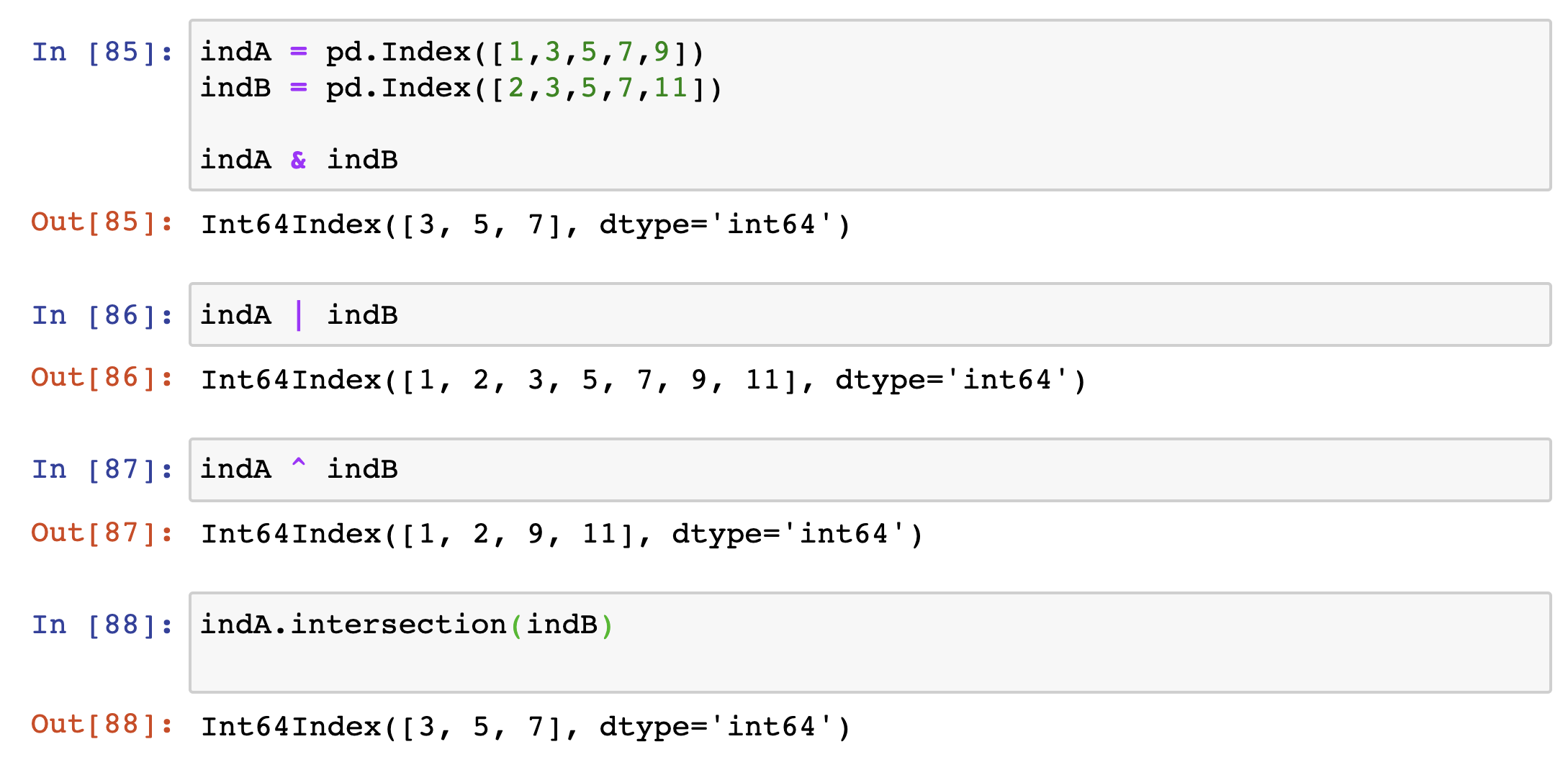Pandas 객체는 집합 연산의 여러 측면에 의존하는 데이터 세트 간의 조인과 같은 연산을 할 수 있게 하려고 고안되었다. 그래서 합집합, 교집합, 차집합을 비롯해 그 밖의 조합들이 익숙한 방식으로 계산될 수 있다.